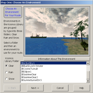 Choisir un Environnement pour votre route Les environnements dans la librairie de Kosmos sont regroupés par catégorie dans trois dossiers: Clair, Pluie et Neige. Sélectionnez un dossier et ensuite un environnement pour utiliser avec votre route. |